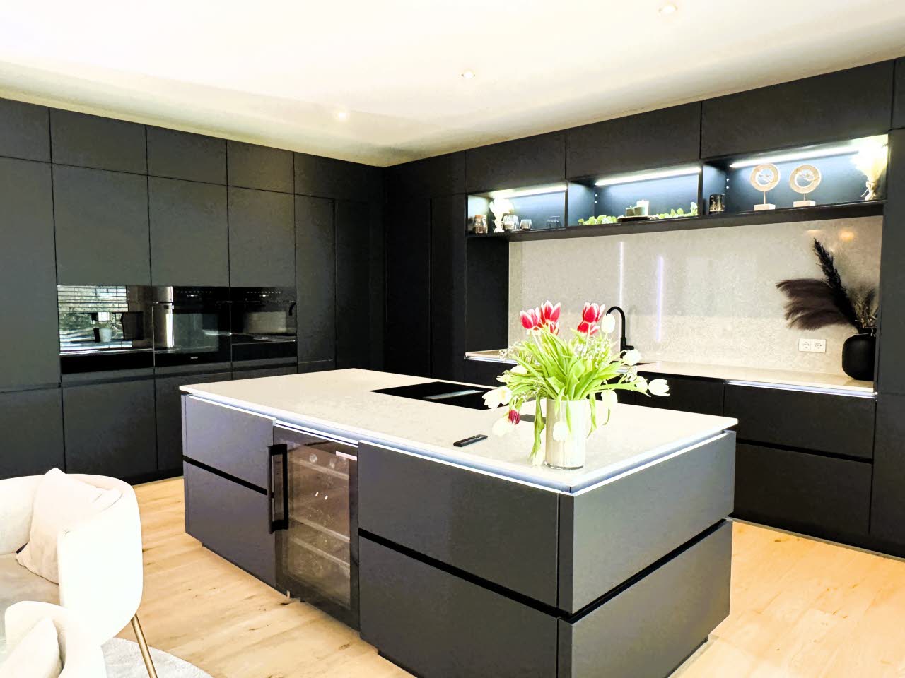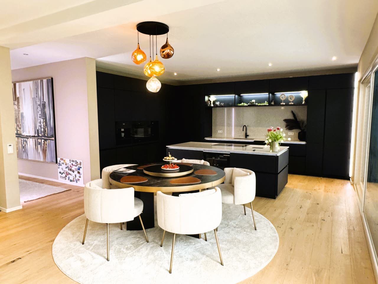 Eine offene Design-Küche, die nahtlos in den lichtdurchfluteten Wohn- und Essbereich übergeht.
