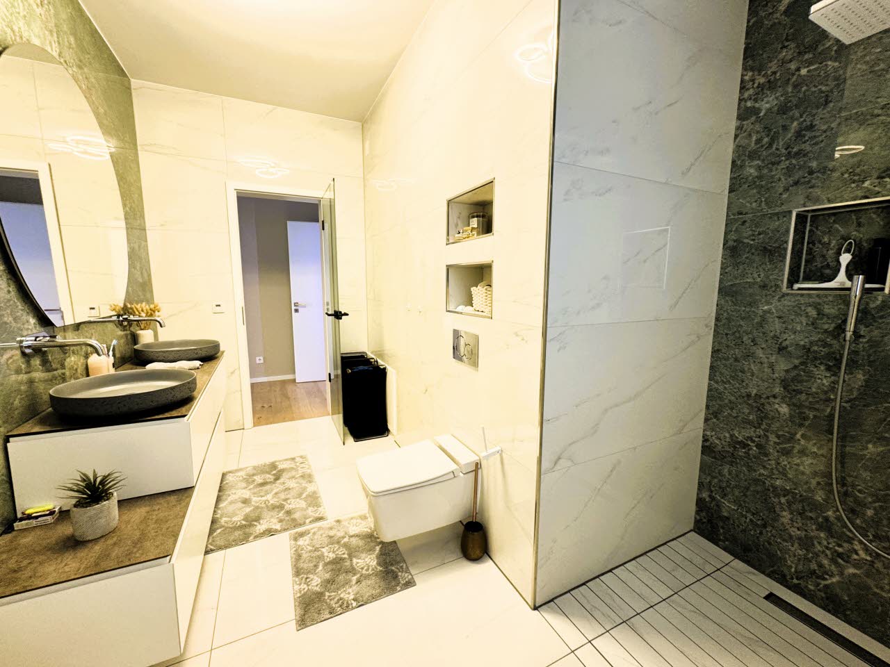 Ein luxuriöses Hauptbadezimmer mit Regendusche, Doppelwaschtisch und edler Ausstattung.