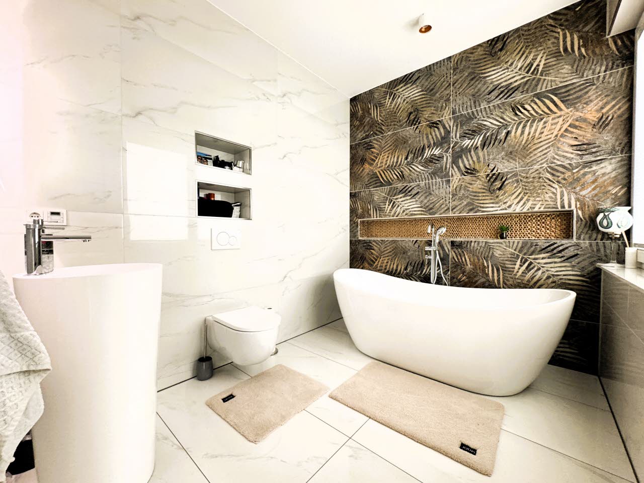 Ein Badezimmer mit freistehender Badewanne – eine Oase der Entspannung.