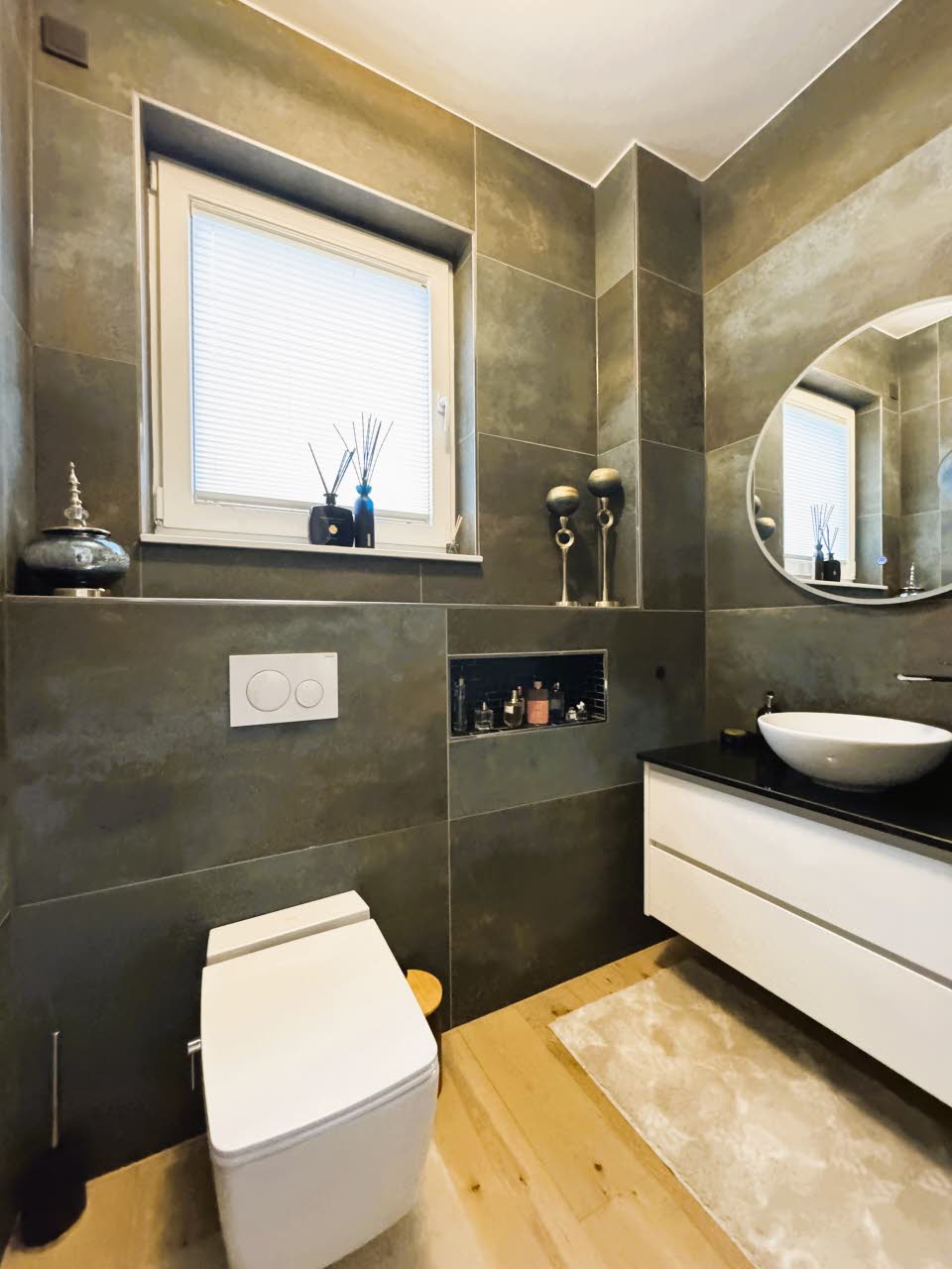 Ein separates Kinderbad mit hochwertigen Fliesen und sanitären Anlagen.