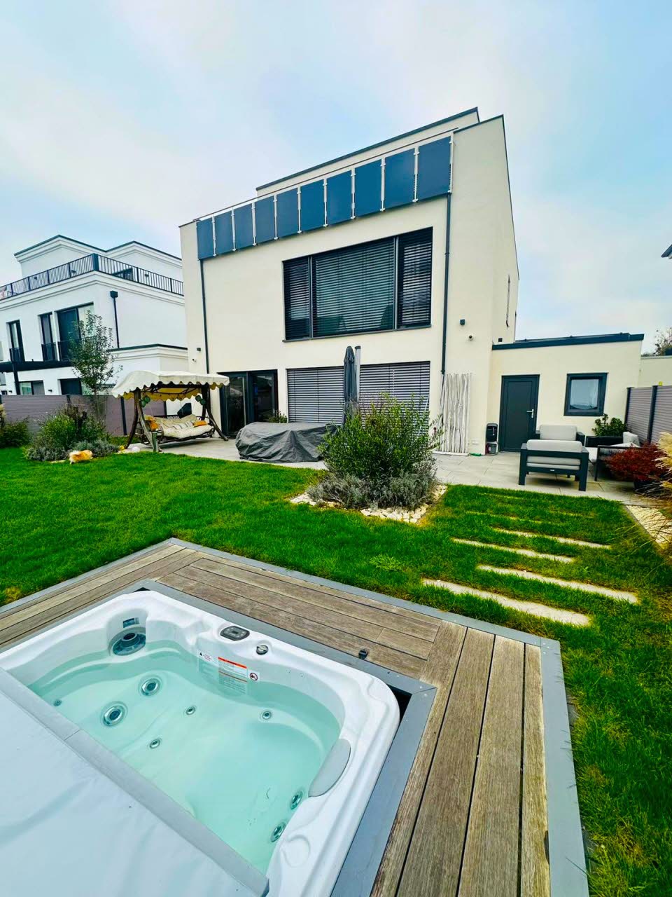 Der pflegeleichte Garten wurde mit viel Liebe zum Detail gestaltet. Die großzügige Terrasse lädt zu entspannten Stunden mit Familie und Freunden ein, während der beheizbare Whirlpool das ganze Jahr über Luxus und Entspannung garantiert. Eine moderne Bewässerungsanlage hält Ihren Garten stets in perfektem Zustand. Ein hochwertiger Zaun aus Gabionen sorgt für Privatsphäre und Sicherheit.